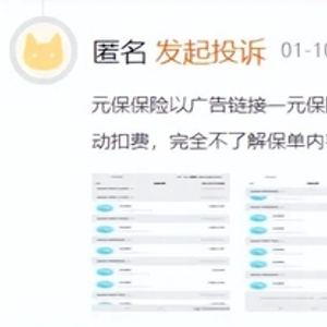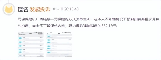 近期,记者关注到,在黑猫投诉平台上,有用户投诉元保平台“1元保”相关问题。例如,今年1月10日的一条投诉显示,“元保保险以广告链接一元保险的方式骗取点击,在本人不知情情况下强制扣费并且次月自动扣费,完全不了解保单内容,要求退款强制消费的362.19元。”