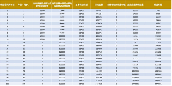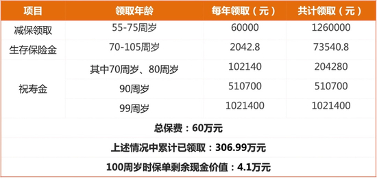 比如30岁的张女士为自己投保“传世金尊”增额终身寿险,每年交50000元,交10年。同时附加鑫福世家养老年金保险,每年交10000元,累计交满10年。从55周岁至75周岁期间,张女士通过减保每年可以领取6万元作为旅游基金,到75周岁时保单内还有现金价值25.5万元。同时,张女士还可以通过附加的养老年金保险,在70周岁至105周岁每年领取生存保险金2042.8元,70周岁、80周岁各领取祝寿金10.2万元,90周岁领取祝寿金51.1万元,99周岁领取祝寿金102.1万元。