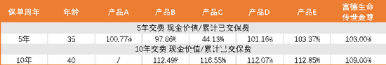 上图通过比较现金价值和累计已交保费的比值可以看出,不管是5年还是10年交费期的“传世金尊”,保单内的现金价值都可以在交费期结束时追平保费,并且5年交费期的“传世金尊”的早期产品利益在同类产品中处于靠前位置。追平保费时间越早,也意味着资金可支配的灵活度更高。
