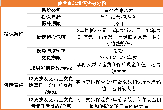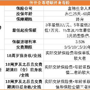 保障方面,“传世金尊”主险提供了身故或全残的保险保障,其保额从第二个保险年度开始按3.5%逐年以年复利形式递增,持续终身增长。且3.5%保额递增写进保险合同,保单的利益有合同保障,不受市场的波动影响,安全可靠。