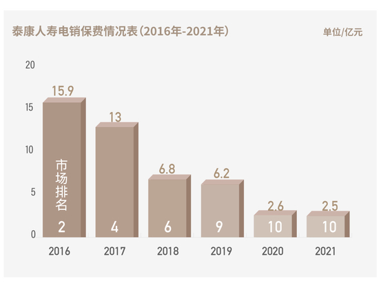 根据中国保险行业协会发布《2021年度寿险电话营销行业经营情况分析报告》显示,2021年,泰康人寿的电销保费为2.5亿元,在21家经营电销的寿险公司中排名第10。此时,泰康人寿的总保费也已经达到1600余亿。