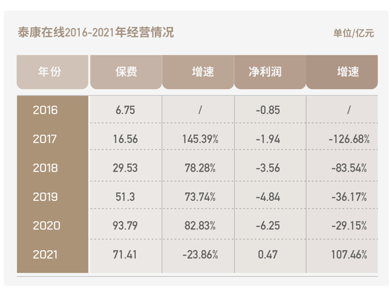 但泰康在线的累计亏损已达17亿元,期间,健康险合计承保亏损4.8亿元,车险合计承保亏损超10亿元,保障保险3.5亿元,意外伤害险则达13.6亿元,其他险种也有着3.5亿元。粗略估算承保亏损超过35亿元。2021年固然实现了近5000万的净利,只是保费规模下降约24%,这是其成立以来从未有过的负增长。