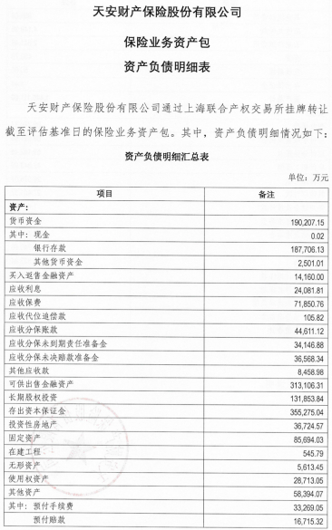被接管两年期满前一个月,天安财险迈出了重大资产处置步伐。6月9日,天安财险保险业务资产包在上海联合产权交易所挂牌转让。