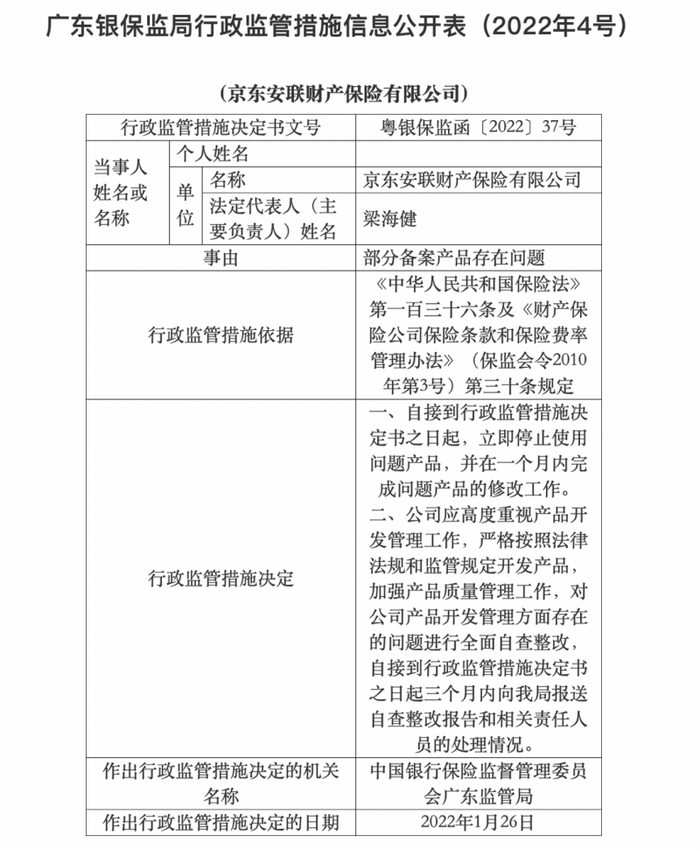 不断上新同时,京东安联年初被点名部分产品存在问题。1月,广东银保监局曾公示行政监管措施信息公开表,京东安联因部分备案产品存在问题被要求立即停止使用问题产品,并在一个月内完成问题产品的修改工作。