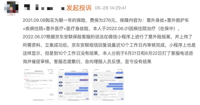 除了理赔难度,京东安联财险理赔效率遭到质疑。6月28日,有投诉者晒出理赔进度以及客服对话截图。理赔进度显示,其购买的京东安联蚂蚁保保障计划理赔申请在6月8日进行初审,并提示会在5个工作日内完成审核,若初审通过,一般案件将在10个工作日内审核完成。根据截图,客服表示当天是第十个工作日,理赔方面将会尽快进行审核。根据投诉者陈述,两度致电催促审核后,至28日仍无结果。同类投诉时有发生。