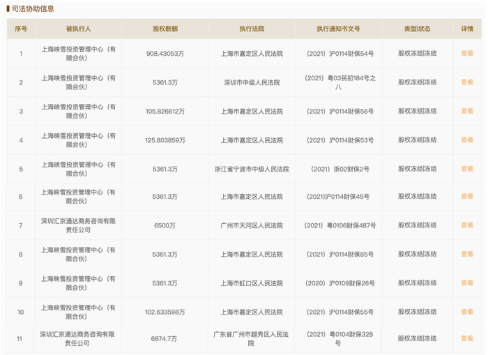 值得注意的是,因汇京通达以及映雪投资成为被执行人,两家股东所持京东安联股权被司法冻结。汇京通达法人为千山资本法人,股东则是另两名自然人;映雪投资背后是私募投资机构映雪资本。