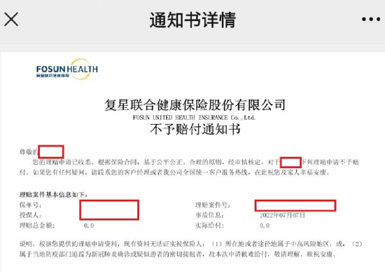 今年7月,上海的丁女士(化名)收到了来自复星联合健康保险股份有限公司(下称“复星联合健康”)的通知书。