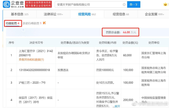 单2020年,安盛天平就有5次被罚记录。