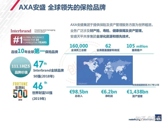 安盛集团业务网络覆盖全球五大洲逾50个国家或地区,拥有全球职员及保险代理人约11万名,用户更是高达1.08亿。