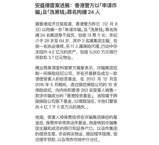 文章《导致香港安盛产品一夜暴跌95%的24人被捕!涉及4亿金额!》表示: