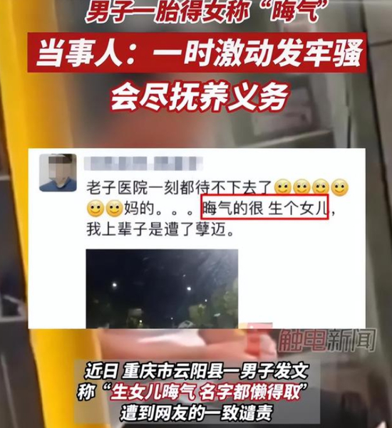 不久前,重庆一名男子,由于妻子头胎生女儿,在朋友圈中大发雷霆,称“生女儿晦气得很,连名字都懒得取”,甚至因为“头胎生女儿一事”打算跟妻子离婚。