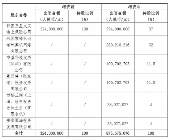 其中,深圳市腾讯网域计算机网络有限公司出资约2.8亿元,增资完成后持股比例为32%,将成为三星财险第二大股东。