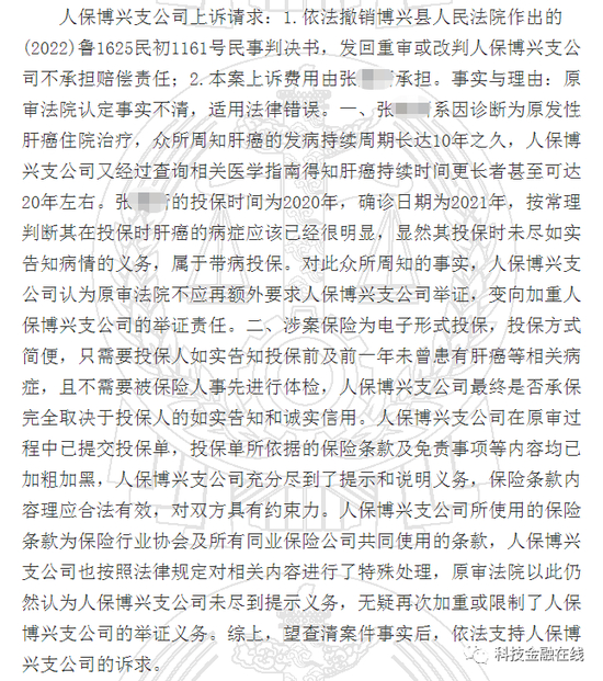 同时,人保博兴公司还表示,张某的投保时间是2020年,确诊年份是2021年,按常理判断张某投保时肝癌的病症应该已经很明显。
