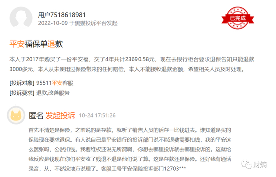 财熵从黑猫投诉上发现,有多位用户投诉在平安银行购买的平安保险产品,出现无法退保的情况。也有人表示,平安银行的员工在推销保险产品时,对客户夸大保险产品收益,甚至将保险产品与银行存款收益相比较,这种行为误导了不少消费者。