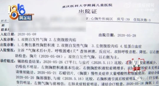 2020年5月,重庆医科大学附属儿童医院的出院诊断写着:1.右侧包裹性胸腔积液;2.双侧自发性气胸;3.左侧腹股沟疝;4.低蛋白血症。雷女士说,孩子肺部切除了一部分,现在已经出院,但已不能做任何剧烈运动。