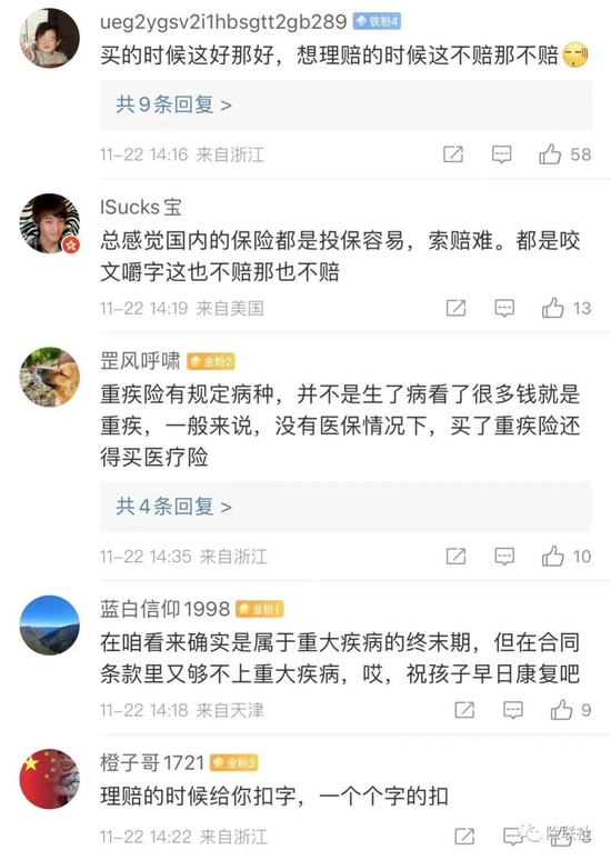 针对此事,网友直言“买的时候这好那好,想理赔的时候这也不赔那也不赔”,还有网友表示“重疾险有规定病种,并不是生了病看了很多钱就是重疾,一般来说,没有医保的情况下,买了重疾险还得买医疗险”。