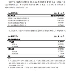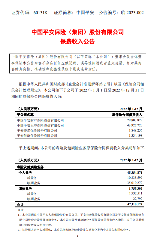 1月13日消息,中国平安发布公告,该公司于2022年1月1日至2022年12月31日期间累计实现的原保险合同保费收入约7691.40亿元。子公司中国平安财产保险股份有限公司、中国平安人寿保险股份有限公司、平安养老保险股份有限公司、平安健康保险股份有限公司原保险合同保费收入分别为2980.38亿元、4392.77亿元、184.83亿元、133.42亿元。