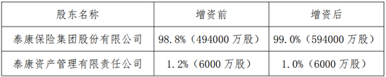 此次增资无新增股东,全部由泰康养老股东泰康保险集团以货币方式出资。增资完成后,泰康保险集团的持股比例由98.8%变更为99.0%,泰康资产管理有限责任公司(以下简称泰康资产)的持股比例由1.2%变更为1.0%。