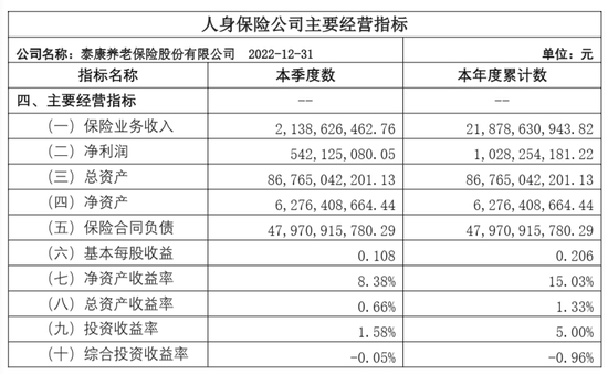 根据2022年第四季度偿付能力报告显示,2022年泰康养老累计实现保险业务收入218.79亿元,实现净利润10.28亿元。