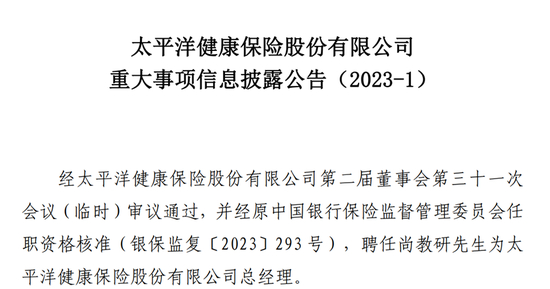 5月底,太平洋健康保险股份有限公司(太保健康险)发布重大事项公告显示,经董事会审议通过,并经原中国银保监管会任职资格核准,聘任尚教研为太保健康险总经理。