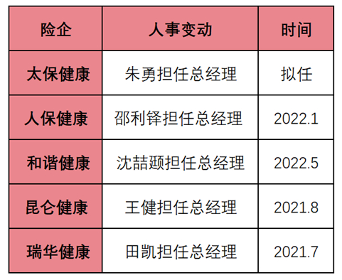 剩余2家昆仑健康和瑞华健康均在2021年下半年总经理一职发生变动。2021年8月,经银保监会核准,王健担任昆仑健康总裁;2021年7月,银保监会核准了田凯瑞华健康总经理的任职资格。