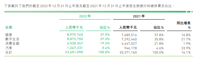 汽车生态主要是与平安合作车险业务,该产品采用与平安产险合作的共保模式,双方按照1:1的比例分摊车险业务相关保费、赔付及其他成本。2022年保费收入12.64亿。