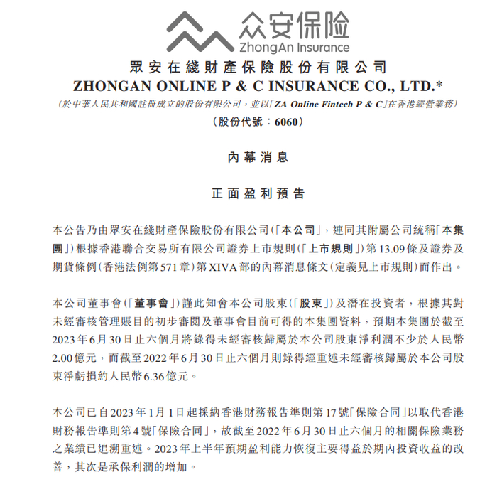 “ 近日,众安在线保险发布盈利预告称,预期集团今年上半年将录得未经审核归属于公司股东净利润不少于人民币2亿元,今年一季度该公司还亏损3.85亿。”