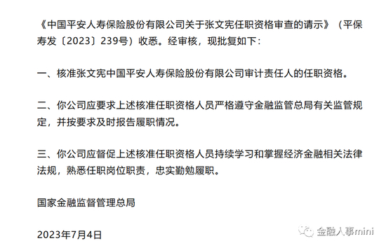 此前,在今年7月,张文宪任职平安寿险审计责任人的资格才被监管批复。