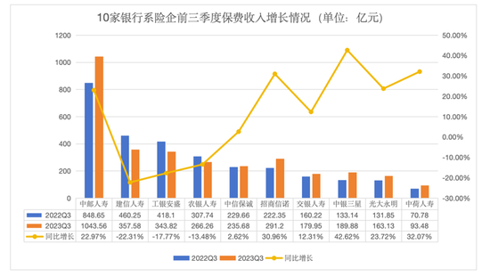 对比10家银行系险企2023年前三季度业绩来看,高达7家险企保费端出现了比较大幅度增长,其中招商信诺、中银三星、中荷人寿这三家保司甚至出现了超30%的增长速度,工银安盛人寿保费增速显然严重掉队。