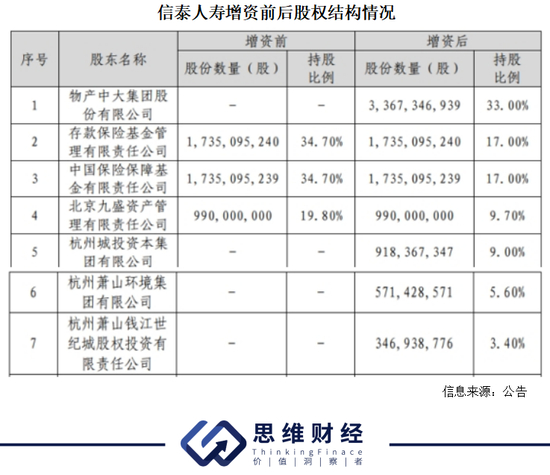 此次增资,存款保险基金、保险保障基金以及信泰人寿其他原有股东并未参与,持股比例将被稀释。增资完成后,存款保险基金、保险保障基金的持股比例均为17%,位列第二、第三大股东。