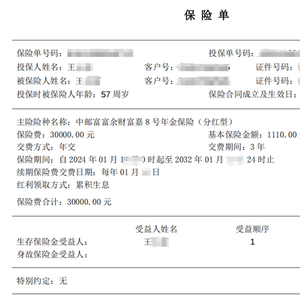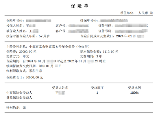老王买的正是中邮人寿发行的“中邮富富余财富嘉8号年金险(分红型)”(以下简称“财富嘉8号”),要连续3年缴费,约定每年交3万元,总保费9万,保险期间为8年。