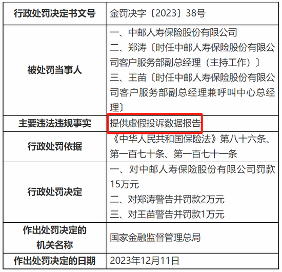 更搞笑的是,为了粉饰太平,中邮人寿居然还提供虚假投诉数据报告,不过这没能逃过监管层的“火眼金睛”。就在上述处罚同月,中邮人寿时隔14天便又收到了新罚单,被罚款15万元,两位相关业务主管一同受罚。
