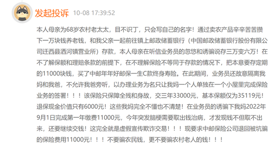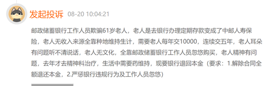 老王解除合同以及老年人去存钱反被诱导买保险的事情,对中邮人寿来说已不鲜见。