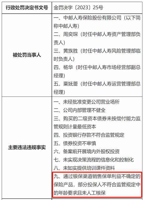 2023年12月1日,国家金融监督管理总局披露的罚单显示,中邮人寿存在9项主要违法违规事实并罚款147万元,4名相关责任人被罚。这份罚单暴露的问题不小,如中邮人寿存在“通过银保渠道销售保单利益不确定的保险产品,部分投保人不符合监管规定中的年龄要求且未人工核保”,“未如实提供培训课件资料”,“债券投资不审慎”。