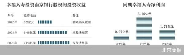 根据计算原则,采用权益法核算长期股权投资的,根据被投资单位实现的净利润或经调整的净利润计算应享有的份额确认投资收益。照此计算,2021年,幸福人寿投资南京银行的投资收益为(158.57×4.07%)6.45亿元,2022年,幸福人寿投资南京银行的投资收益为(184.08×3.93%)7.23亿元。但2021年和2022年,幸福人寿的净利润分别仅有5.16亿元和1.71亿元。也就是说,幸福人寿投资南京银行获得的投资收益已经超过幸福人寿当年的全部盈利。