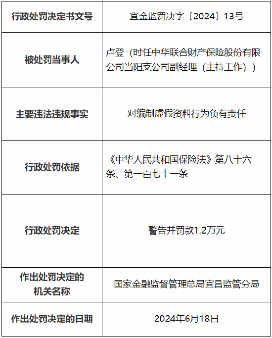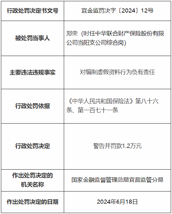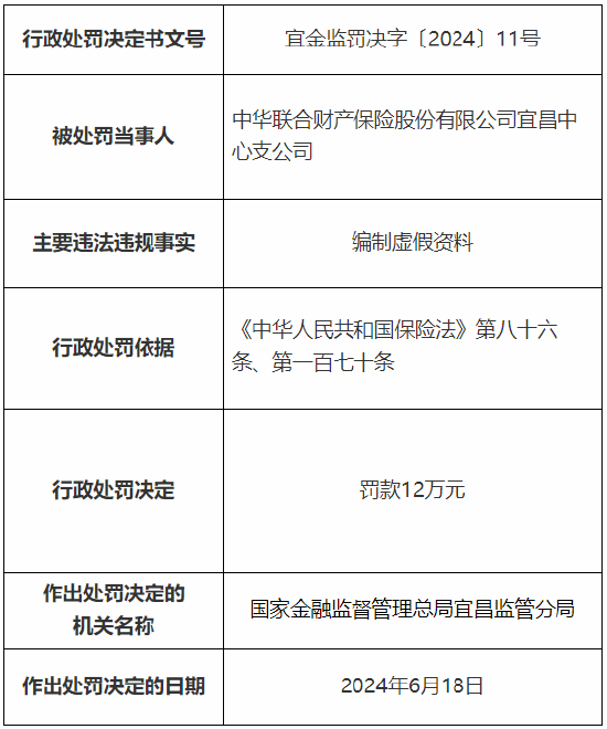 中华财险宜昌中心支公司被罚12万元:因编制虚假资料