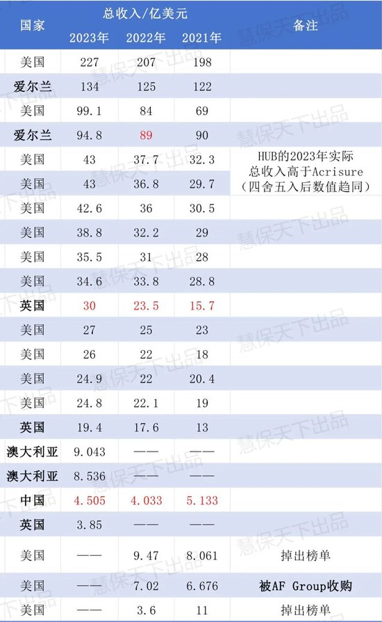 Howden与USI Insurance Services互换排位。值得注意的是,Howden在近三年一直保持上升态势,从2021年的第15名快速爬到了2023年第11名,其总收入也相应地从15.7亿美元增至30亿美元,增幅约91.08%,是榜单中近三年来增长最快的公司;