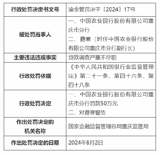 8月12日金融一线消息,国家金融监督管理总局重庆监管局行政处罚信息公开表显示,中国农业银行股份有限公司重庆市分行因贷款调查严重不尽职,被国家金融监督管理总局重庆监管局罚款50万元;时任中国农业银行股份有限公司重庆市分行副行长费寒被警告。