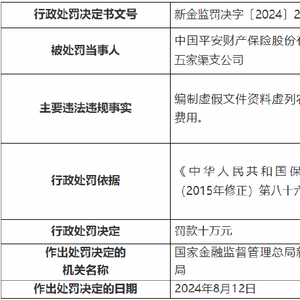 平安产险五家渠支公司被罚10万元:因编制虚假文件资料虚列农业保险费用
