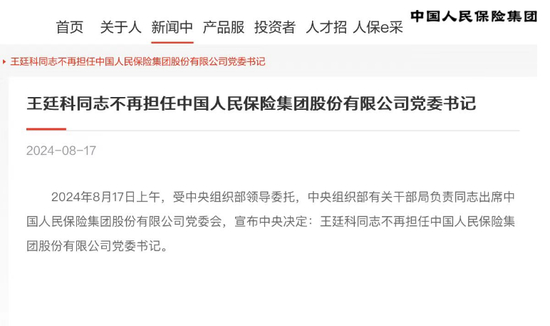 就在8月17日上午,中国人保官网发布消息称,受中央组织部领导委托,中央组织部有关干部局负责同志出席中国人保党委会,宣布中央决定:王廷科同志不再担任中国人保集团党委书记。
