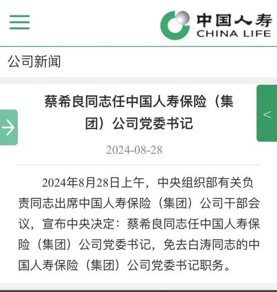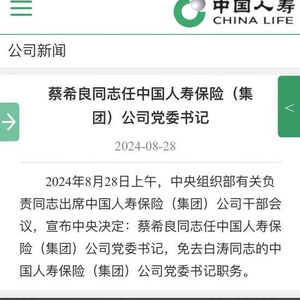 8月28日,中国人寿发布重磅消息,经中央决定,蔡希良任中国人寿保险(集团)公司党委书记,免去白涛中国人寿保险(集团)公司党委书记职务。