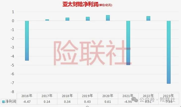 从过往的财务记录来看,2016年至2023年,亚太财险的净利润分别录得-4.47亿元、0.14亿元、0.34亿元、0.43亿元、0.61亿元、-4.96亿元、0.51亿元以及-7.06亿元。这一系列数据反映出,亚太财险在盈利与亏损之间频繁切换,且亏损的幅度往往大于盈利,显示出其经营稳定性的不足。