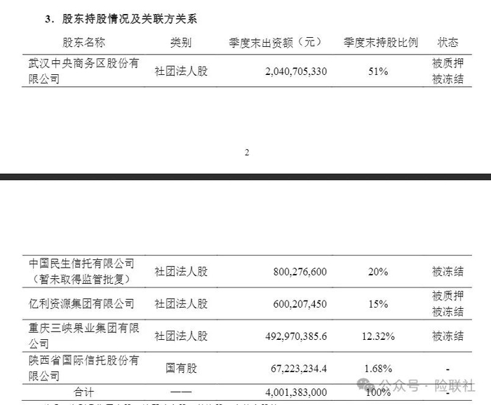 值得一提的是,由于债务纠纷,亚太财险的股权几经周转,截至目前,亚太财险前四大股东的股权均存在被冻结的情况。据其2024年第二季度偿付能力报告显示,武汉中央商务区股份有限公司、中国民生信托有限公司、亿利资源集团有限公司、重庆三峡果业集团有限公司所持有的98.32%股权均被冻结。