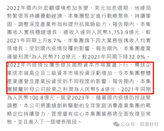 整体来看,自2022年开始集团盈利水平猛降,相较2021年同比下降94.66%,依据2022年年度报告,主要是当年疫情反复多发及国际资本市场震荡下行,导致企业成本端高企及二级市场投资浮亏增加,使整体产业营运及产业投资受到不同层度的影响。