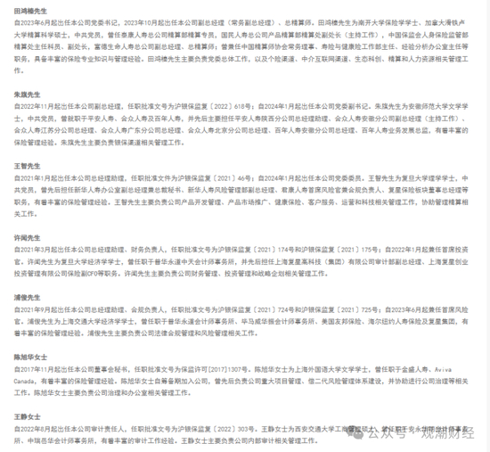 截至2024二季度偿付能力发布,“复保”高管班子(包括董事长)共8位,包括董事长赖军;党委书记、副总经理(常务副总经理)、总精算师田鸿榛;党委副书记、副总经理朱旗;总经理助理王智;总经理助理、财务负责人许闻;总经理助理、合规负责人浦俊;董事会秘书陈旭华以及审计责任人王静。