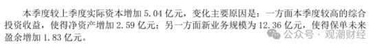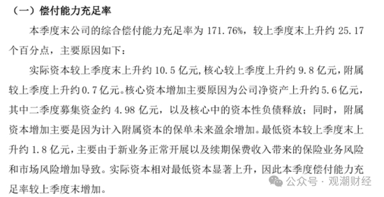 根据公司偿付能力报告,偿付能力增强主要原因在于二季度本季度较高的综合投资收益,使得净资产增加2.59亿元;另一方面新业务规模为12.36亿元,使得保单未来盈余增加1.83亿元。