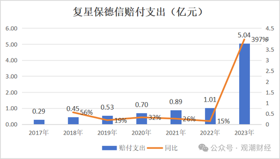 其赔付支出更是跨级别式增长,2017年-2021年该公司的赔付支出未达到亿元级别,在2022年首次实现亿元级别的赔付支出,而在2023年,其赔付支出甚至达到了5.04亿元,较2022年同比增长397%。