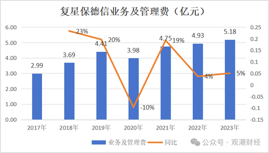 从费用端来看,复星保德信2023年实现业务及管理费5.18亿元,较去年同比增长5%。