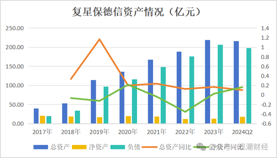 从资产端来看,复星保德信的总资产处于持续上涨趋势,今年二季度总资产为215.72亿元,较去年同期同比增长9.93%;净资产波动较大,今年二季度实现17.68的净资产,较去年同期增长16%。