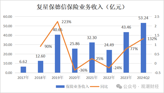 从收入端来看,该公司的保险业务收入持续波动,今年二季度实现53.24亿元的保险业务收入,较去年同期增长132%。
